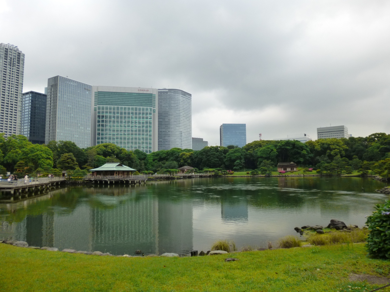 久しぶりに、浜離宮庭園に行きました。日本への旅行者が増えているせいか、外国人観光客の姿も多かったです。緑の向こうに高層ビルが見え、池にも和風建築と現代ビルの両方が映る面白い風景を楽しむことができます。