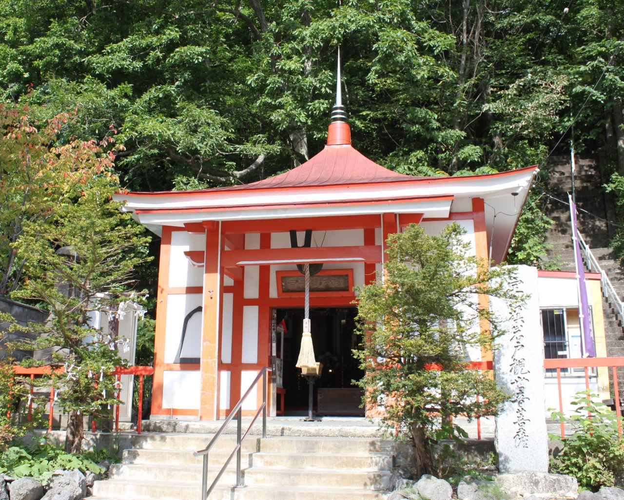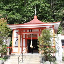 月見橋を渡って温泉街に入ると、突き当りに朱のお堂が見えてきます。