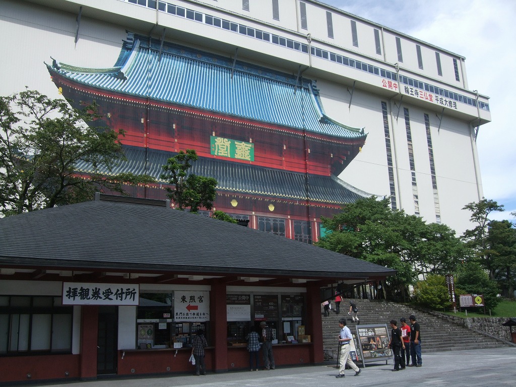 お堂全体を覆っての大修復中で、平成31年(2019年)3月まで予定されています。でも、内部は公開されていて、黄金色に輝く千手観音や、阿弥陀如来、馬頭観音が拝めます。どんな人たちでも漏らさずに救うと言われている観音様の顔が、ふっくらと穏やかなお顔をしていました。立像を想像していましたが、坐像でした。