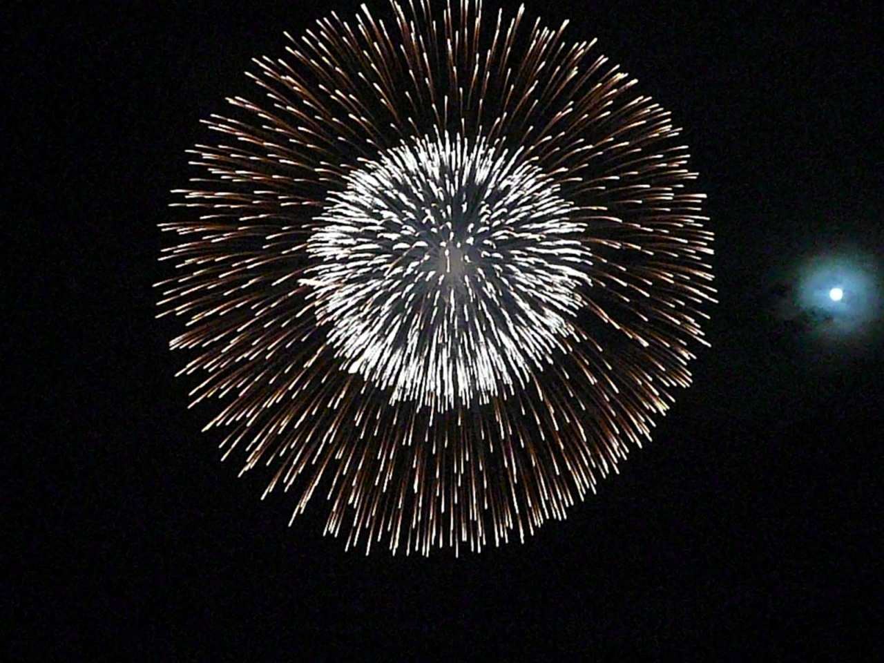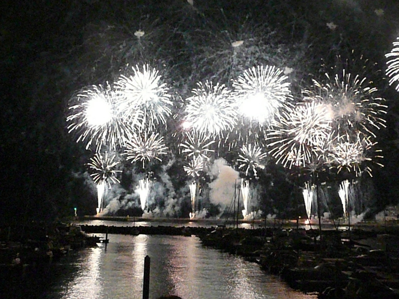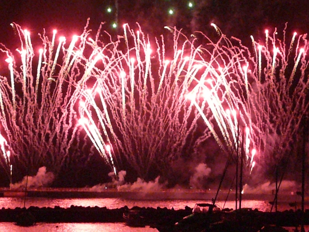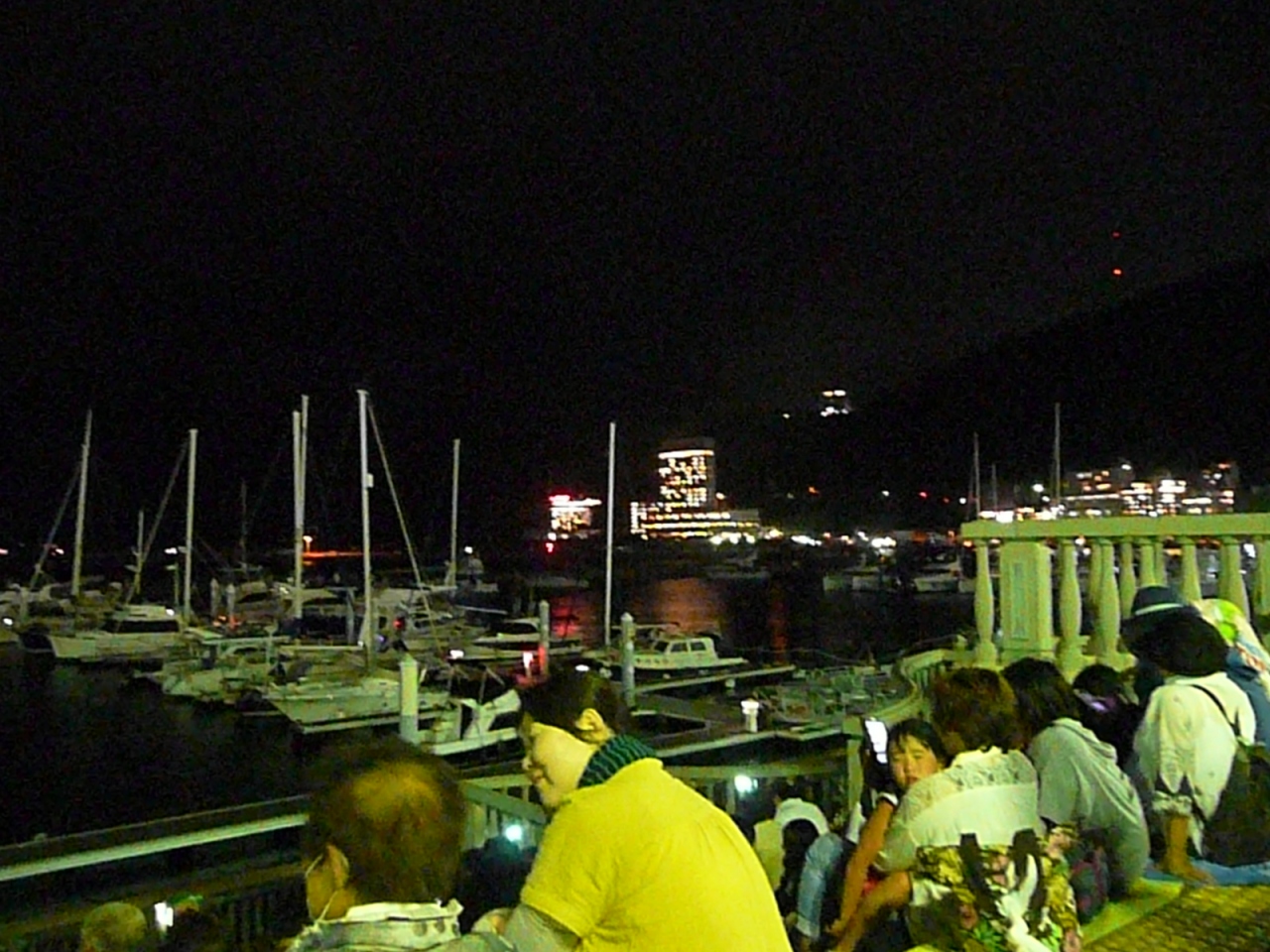 花火が始まったのは8時過ぎでしたが、海岸に用意された観客席は満席でした。各種の花火が海上に次々と打ち上げられ、天空を染める花火の景観は圧巻でした。夜空を彩るショーは、約30分続きました。