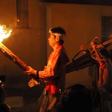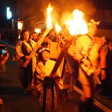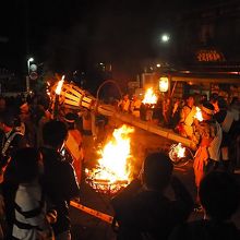 午後6時から点火されて祭が始まる予定でしたが、5時から交通規制が始まりました。火が点火し始める山門下の場所で待ち構えていたのですが、たくさんの警察官達が道に沿って立ち並んで、「立ち止まるな」とどなりはじめます。まだ火が一つも点灯されていないうちからお祭りが何も見えない裏の畑道に送り出されます。道は狭く、足下は悪く、ここで人の渋滞が始まります。まだ何もみていない段階でお祭り会場から外に出されて、畑道の中に取り残された状態です。子供達やお年寄りはへとへとに疲れ、カップルはけんかを始め、何が何だかわからない外人の人たちはただただ困惑するだけ。この間にお祭りは開始され、川の反対側で煙があがり、歓声で賑わうのを横目に見てただただ待たされるのみでした。そこを抜けるのに30分くらいかかったでしょうか。その時点で「もうイヤだ。」とばかりに帰りの電車の方に向かう人々も数多くいました。まだほとんど火を見ていないのに。さすがに火を見ずに帰るのは癪なので2周目にトライしましたが…。後で考えると火を見ずに帰った人たちが正解だったようにすら思えます。メインの道路ではたいまつに火をつけている人、火の付いたたいまつをもって歩く人などがいて活気があります。しかし警察官達がとにかく「立ち止まるな」「写真を撮っている暇があったら前へ進め。」とばかりにハンドマイクで怒鳴りつけます。写真を撮っていると前に立ちふさがって、ひどいときには両手を挙げて撮影の邪魔をする警官もいました。