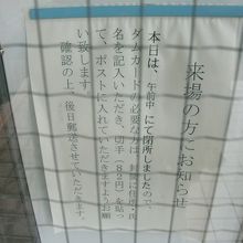 管理所に職員がおられれば、お願いすればダムカードを頂くことができますが、訪れたときは午前中に閉所したとの表示があったので、切手を貼った封筒に住所氏名を書いてポストに投函して、ダムカードを送ってもらうようお願い(添付写真参照ください)し、後日郵送してもらいました。