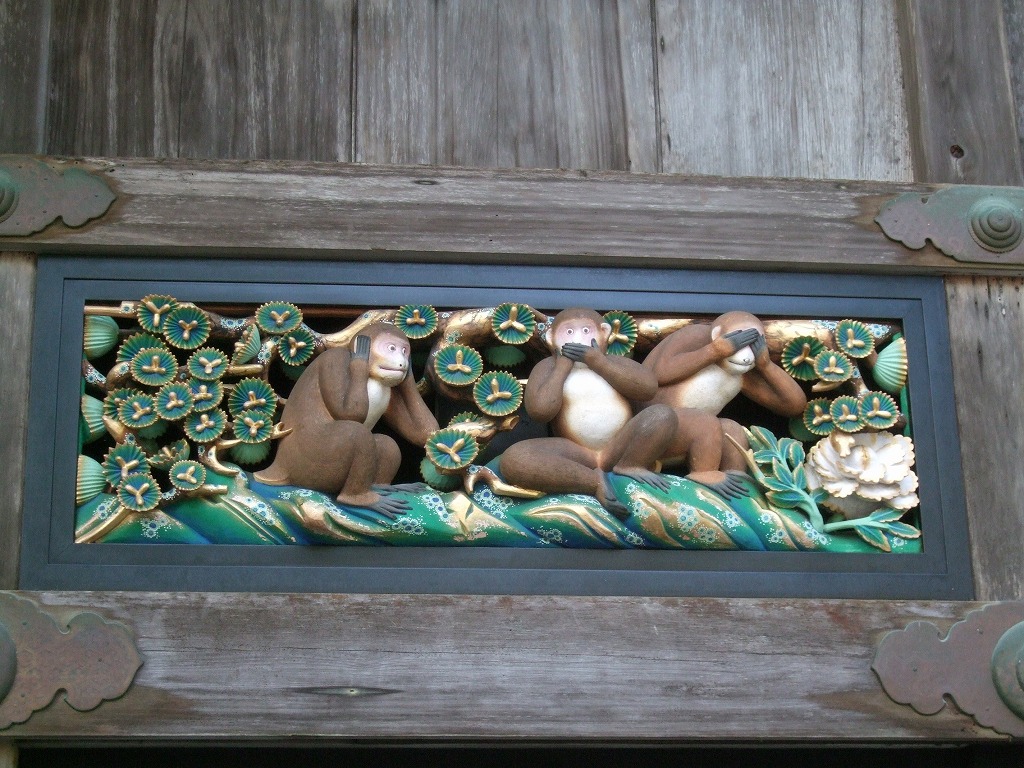陽明門をはじめとして、三猿、眠り猫、なども全て改修中で、飾ってあるのはレプリカ(複製)がほとんどです。陽明門は写真をプリントしたスクリーンで覆われています。それでも、素晴らしさは良くわかります。