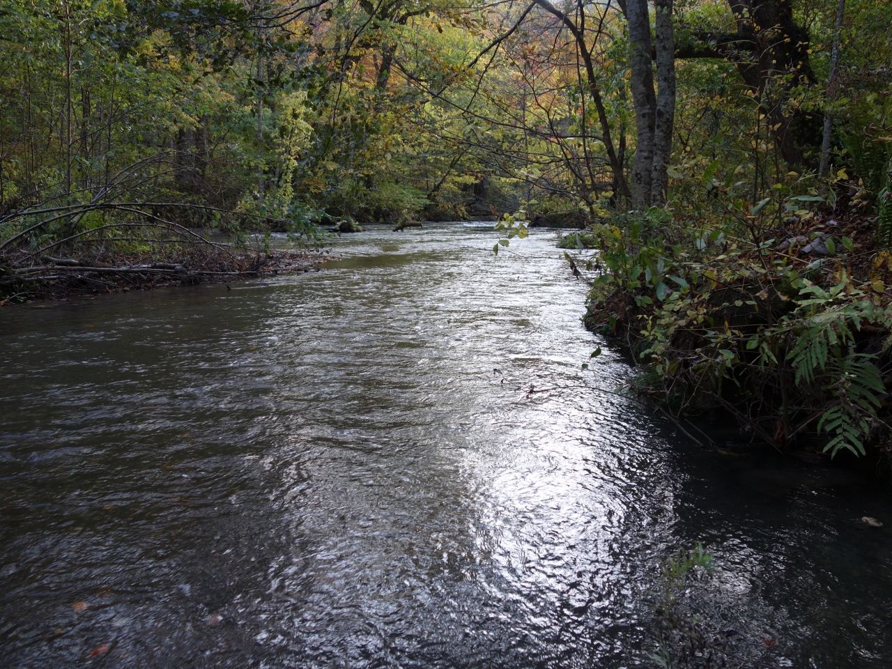 駐車スペースがひろい。渓流の主要バス停。トイレも整備。みやげ物店もある。