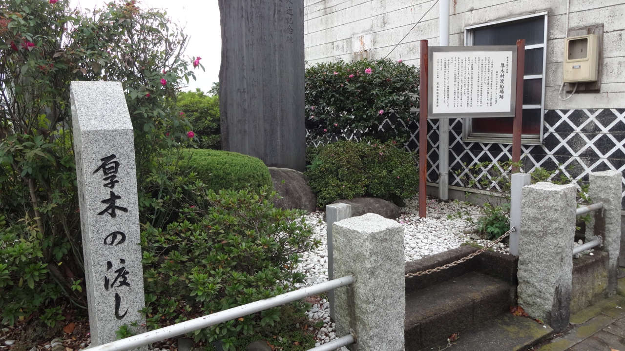 小田急「本厚木駅」北口から徒歩約15分、相模大橋の北に架かる「あゆみ橋」の袂にあります。矢倉沢往還(大山街道)は対岸(海老名側)の「河原口」から夏は船渡しで相模川、中津川、鮎川を越えて厚木側に入り、冬は川に仮橋が設けられたとのこと。1831年9月、厚木を訪れた渡辺崋山の「厚木六勝」図の一つ「仮屋喚渡」は、この場所を描いたものだそうです。「旧厚木村渡船場跡」の説明板と「渡辺崋山来遊記念碑」が隣合わせで建っています。1908年の「相模橋」の開通によって、廃止され、その役目を終えました。当時、この界隈はさぞ賑やかだったのだろうと昔を偲びました。