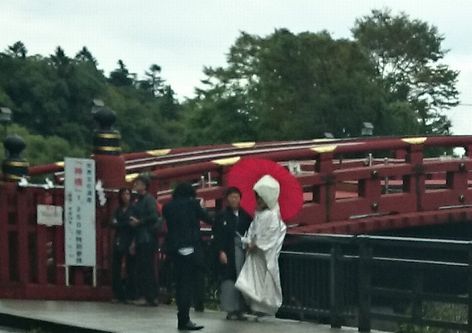 日光二荒山神社で結婚式を挙げられたのでしょうか?神橋をバックに白無垢姿の花嫁と花婿が記念撮影をしていました。