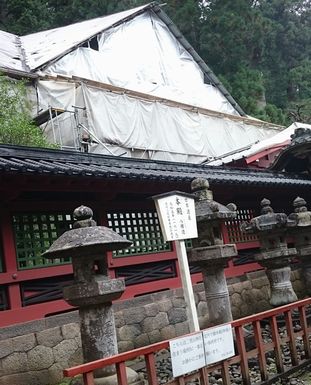 日光二荒山神社の神苑内にあります。受付にて拝観料を支払い入り、右手奥に進むと本殿の参拝所がありました。ここが神様に一番近い参拝所と言うことで、しっかりとお参りしてきました。本殿は改修工事中で白いシートに包まれていました。
