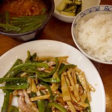 チンジャオロースは肉は勿論、ニラ・筍がたっぷり。油をたっぷり使って炒めてある(したがって、カロリーは高そう)。味付けは濃い目で、ご飯が進む。