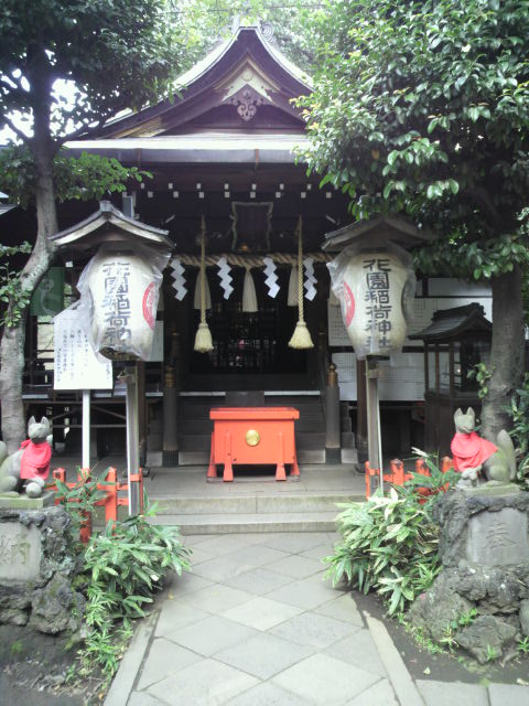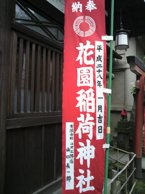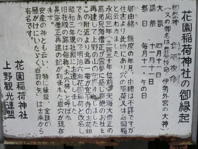 ご神体が岩窟の中にあったことから、昔は、穴神社とか場所の名前から忍岡神社と呼ばれていましたが、江戸時代初期、上野寛永寺のお花畑であったことから、花園稲荷神社として命名されました。