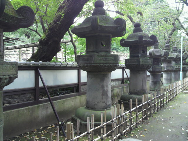 大名の格の上下に応じ、格上の大名は銅製の灯籠を、格下の大名は石製の灯籠を寄進しました。