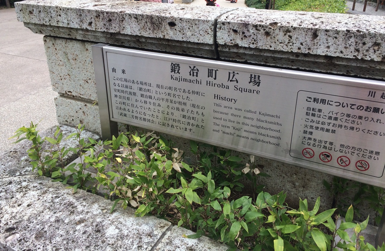 現在の地名は仲町ですが、以前は鍛冶町と呼んでいたので、この名称になっています。蔵町通り沿いにあり細長い公園で左右は建物で景観は今ひとつですが綺麗に整備されベンチがあるので、食べ歩き用のだんごを飲み物と一緒に食べゆったり出来ました。