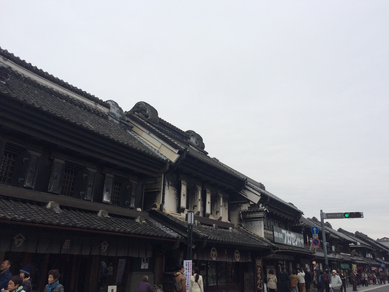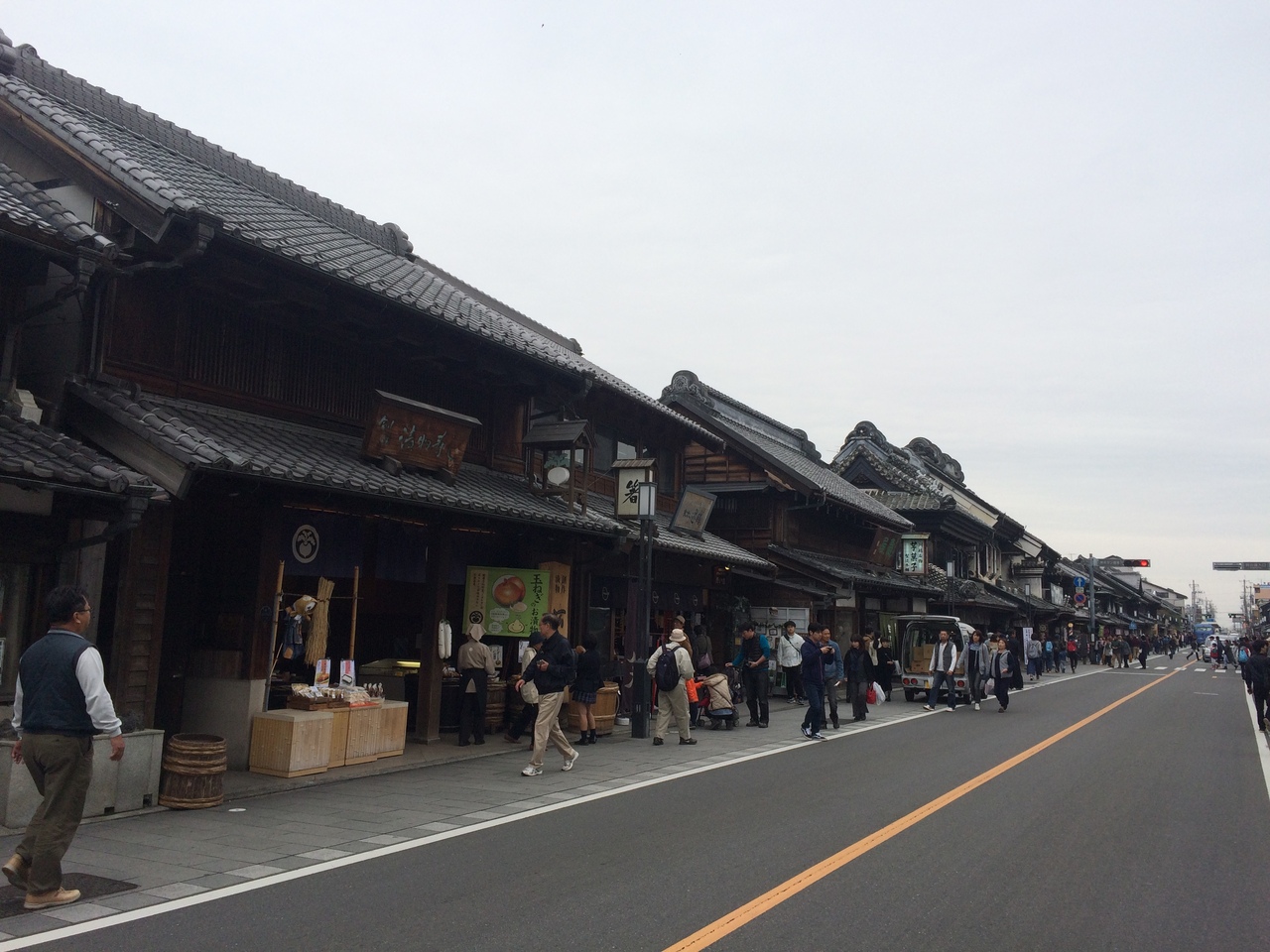 道路の左右には昔ながらの蔵が建ち並び土産屋、食事処、雑貨屋等があり、お寺や公園もあり、景観が良いですが車道が中央に通っていて通行量も多いので歩くには注意が必要です。町並みの通りから逸れる道もいくつかあり見所が多いです。