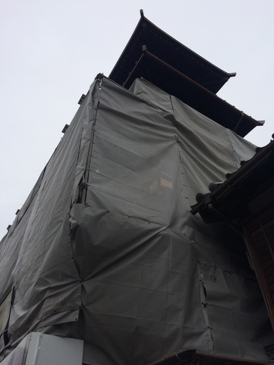 2016年10月に行きましたが、工事中で、白い幕が垂れていましたが、上部、鐘のあたりは幕が貼ってなく見上げてみましたが、やはり迫力がなかったです。建物の前には工事現場の監督のような人もいました。観光スポットなので白い幕が貼って工事中でも皆、写真を撮っていました。
