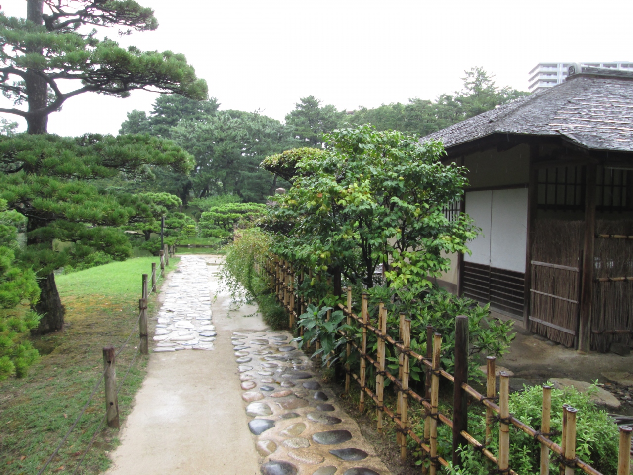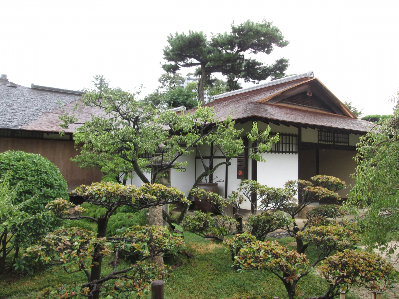 縮景園の見どころのひとつです。入園して正面、園内のほぼ中央に位置します。数寄屋風書院造りで屋根がこけら葺になっていました。東側には花頭窓を設けて跨虹橋に臨み、西側は優雅な書院造りの様式でした。鬼瓦に浅野家の裏家紋である桔梗の紋が入っているので見逃さないようにしたいところです。
