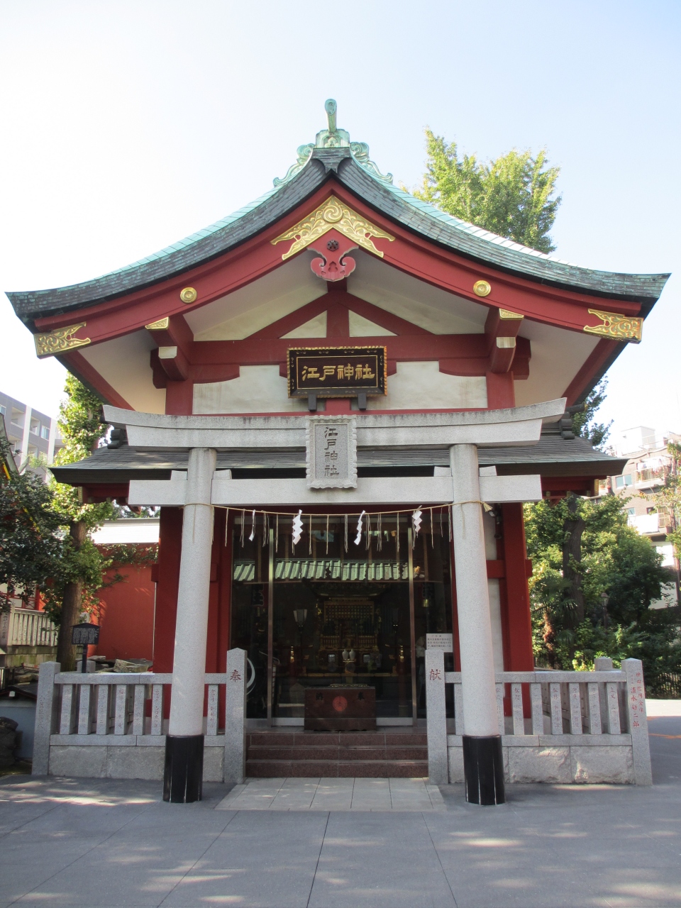 神田明神内には数多くの神社が造られ、いろいろな神様が祀られています。この神社もその一つで、1300年以上前に皇居内で創建されたのち、今の地に移り400年が過ぎようとしています。神社内には大きさが日本一の神輿と書かれた豪華な神輿が飾られています。富岡八幡宮にも同じように書かれた神輿が飾られています。どちらが日本一かわかりませんが、ともかく御利益が大きそうに感じる神社と神輿です。神殿の左奥に建っています。