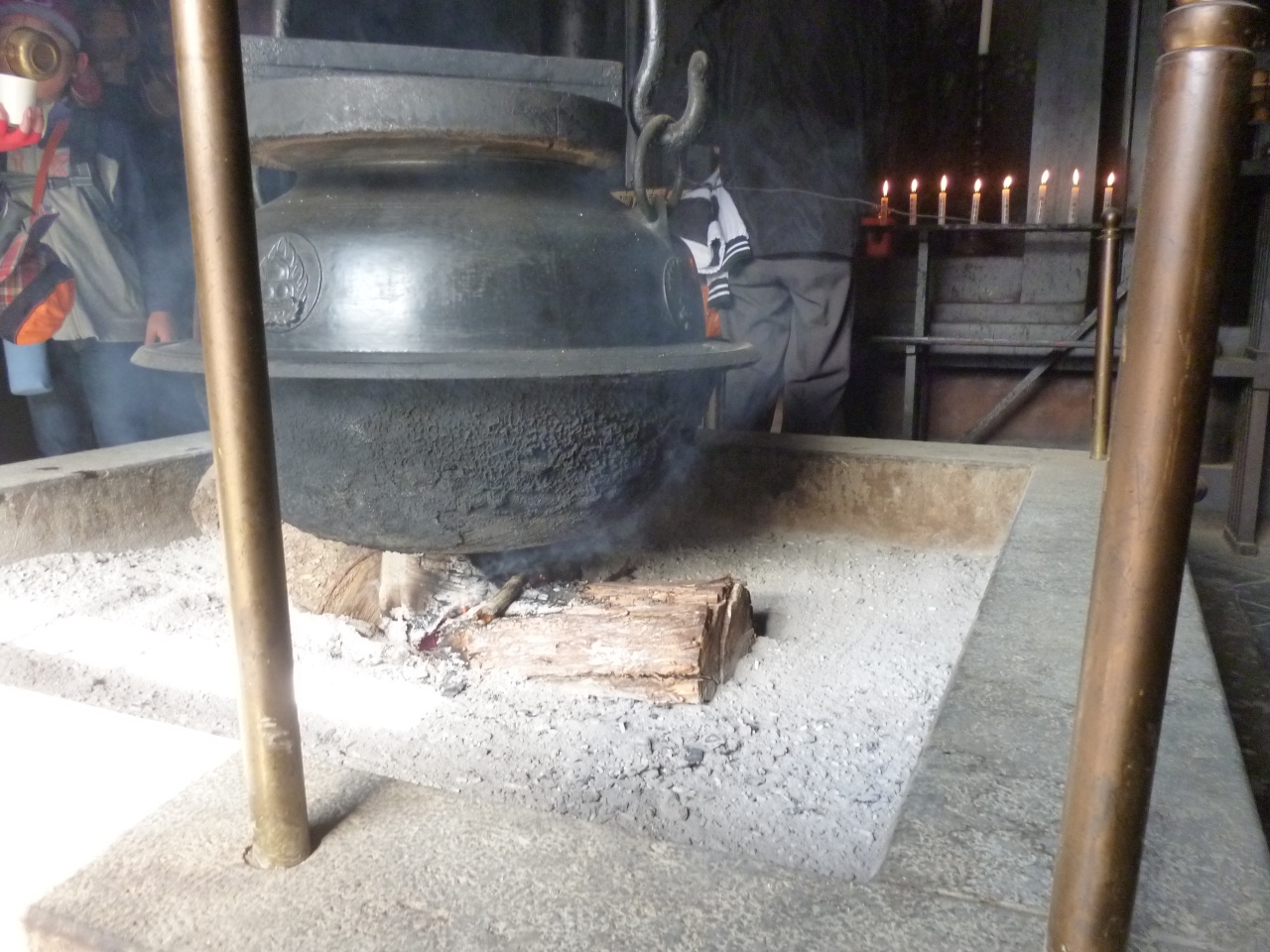 弘法大師様の炊いた火を、絶やさないように守っておられました。火の上には大きな釜があり、中のお湯を飲むことができました。お堂の中は煙でいっぱいで、大変でしたが煙を全身に浴びながら、ありがたく見学しました。