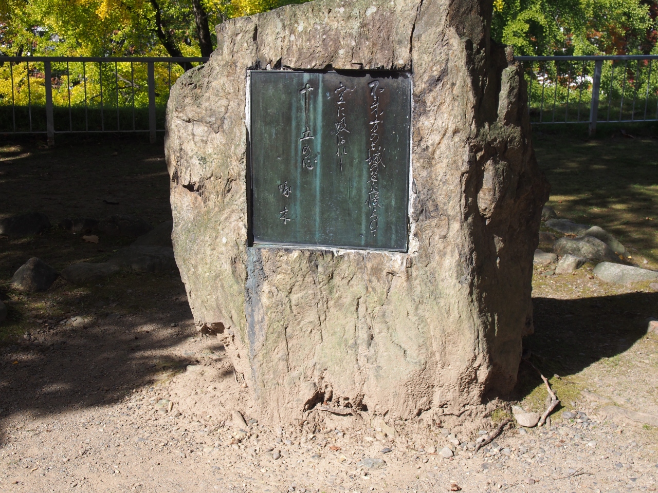石川啄木の歌碑は、盛岡城跡の公園を歩いていて、観光案内板の地図に記入されていたので立ち寄りました。三の丸付近の広場に1m大ほどの大きさの石碑がありました。啄木が学生時代に学校をさぼり、盛岡城跡で寝そべって詠んだ句のようです。盛岡市内にはいくつかの啄木ゆかりの場所があるので見て歩くのも楽しいです。