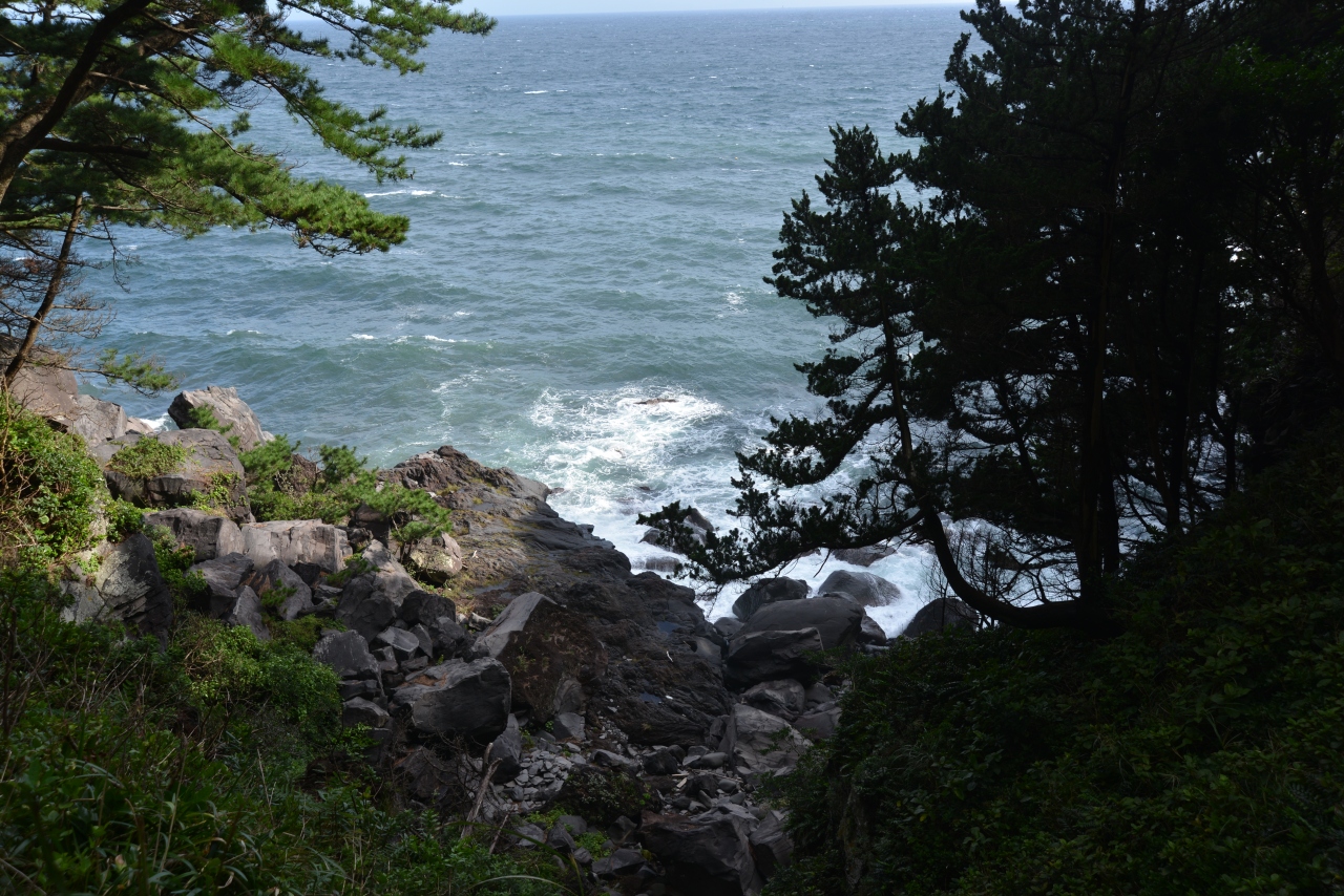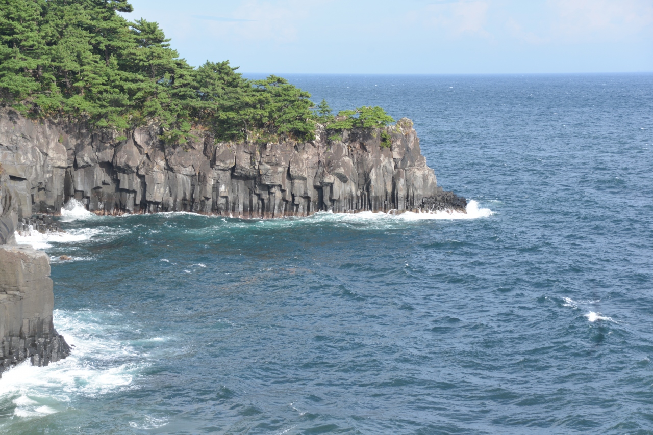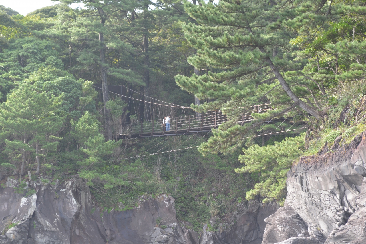 伊豆高原駅裏に駐車場がありますが、狭いです。そこから、川沿いをそって森の中を海に向かって下っていきます。10分ほど歩くと海が見えてきます。断崖絶壁の雄大な光景が広がります。林の中を歩くと、吊橋に出ます。吊橋は塗装やコンクリート劣化対策が施されていて安心して渡れます。揺れますが解放感あっていい気分です。吊橋の手前から海岸に降りることができます。