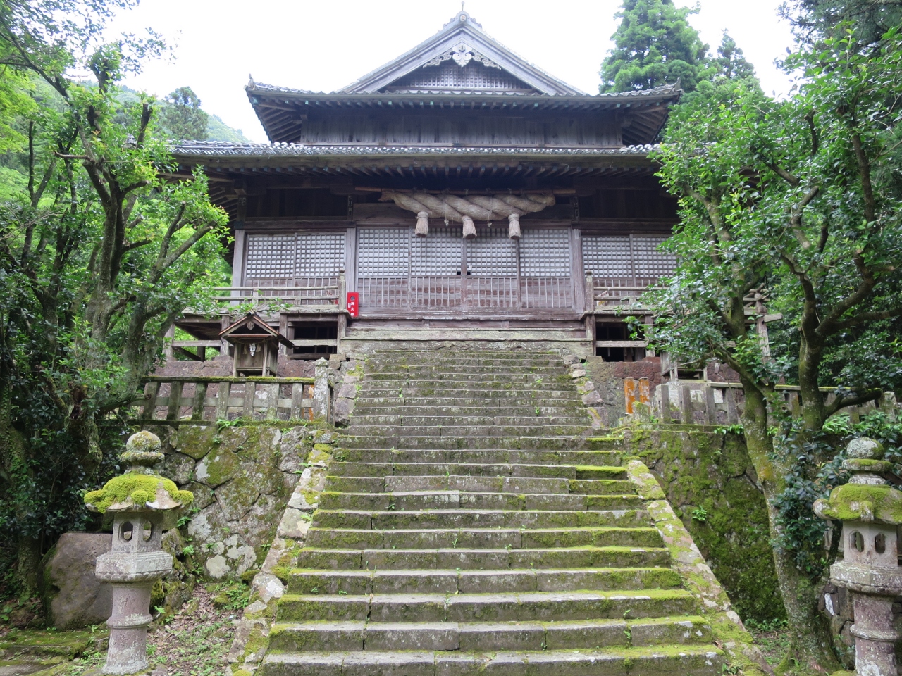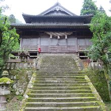1434年に大内氏が石見銀山の守り神として建立したと云われる神社です。石段は苔が生え所々荒れている上、急登で手すりもないため結構危険です。上りはまだ良いですが、下りは足を踏み外さない様に注意が必要です。