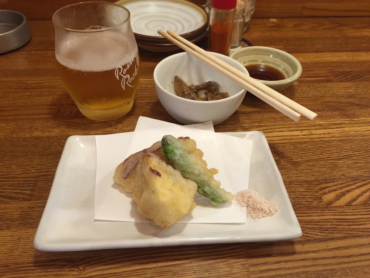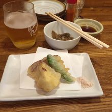 鳴門金時天ぷらと徳島餃子を食べました、鳴門金時はホクホクして甘くとても美味しかったです、餃子は焼きを食べましたが一口サイズでラー油ではなくて、柚子胡椒で