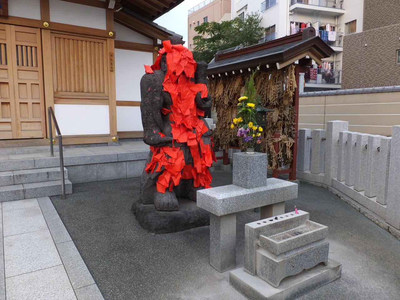 一度見たら忘れられません。道路の脇に1対の仁王像。それが全身幅5cmくらいの赤紙数百枚で覆われつくされています。自分の悪い部位に貼って治してもらうのだそうです。そしてその隣には草履のいっぱい架かった板壁。治ったお礼に納めるのだそう。
