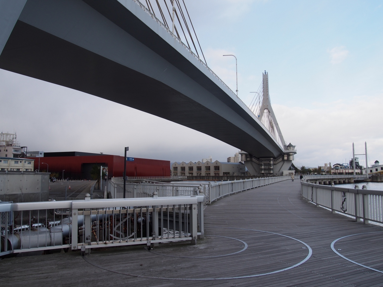 アスパムの裏手の海岸線から青函連絡船八甲田丸がある場所を結んでいる橋です。ちょうどベイブリッジの下付近に橋はあります。橋は木製の歩行者専用の橋で、海の上を通っているので、海風にあたりながら歩くのは気持ちいいです。