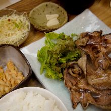 メインとなる豚の生姜焼き、サラダ、小鉢、漬物、味噌汁、ご飯から成る。