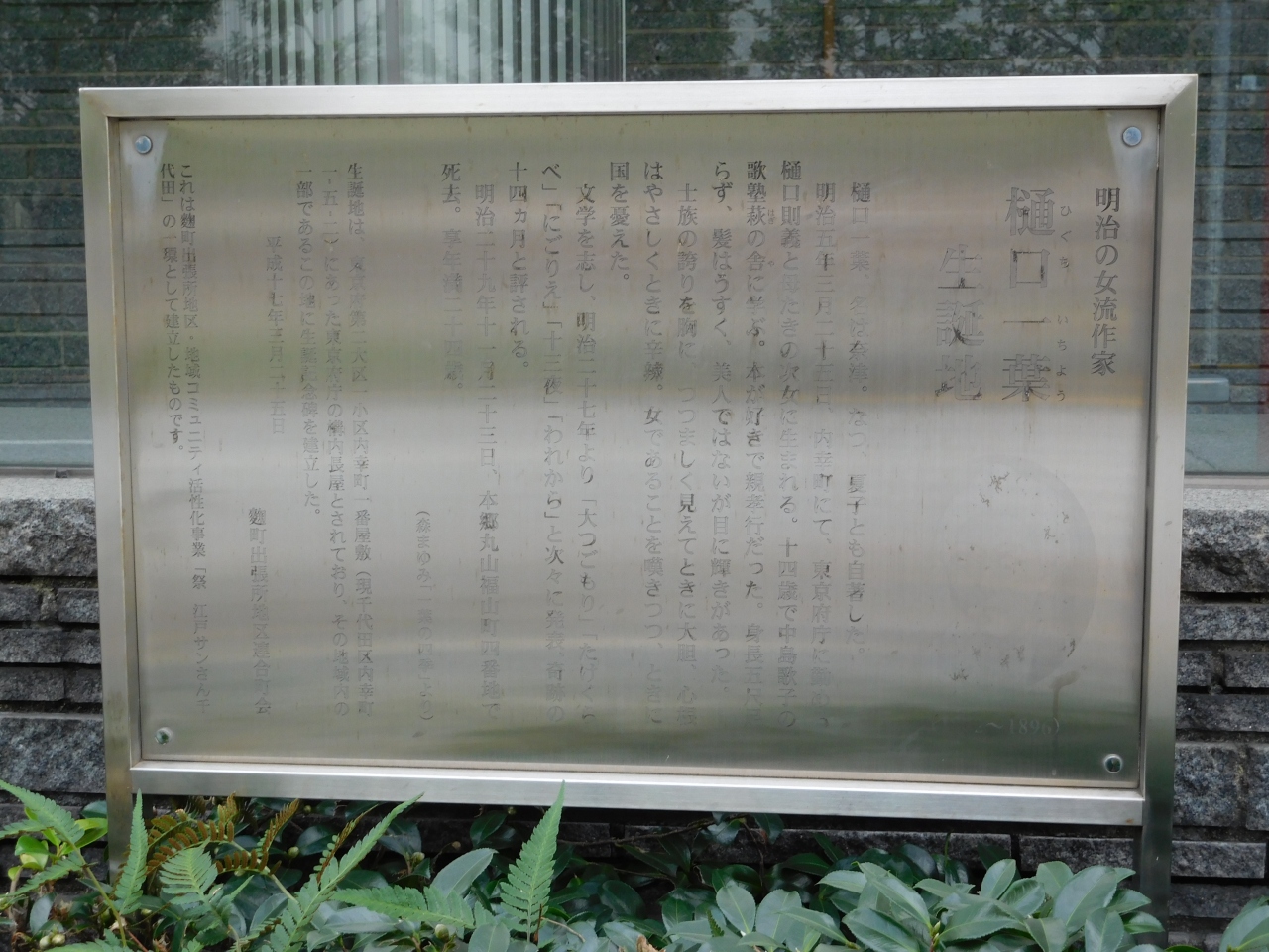 「内幸町ホール」交差点の角にある、内幸町ホール入口近くの道路側(国会通り沿い)の植え込みに記念碑がありました。大分年季が入っていて、ずいぶんと文字がかすれてしまっていました。えっ、こんな場所に記念碑があったんだ、と思わずびっくりしてしまいました。右下に写真があったと思われますが、すっかり消えてしまっています。今は文字だけの碑になってしまい、しかも、文字がはっきり読めない状態で、折角の記念碑が勿体無いような気がしてしまいました。