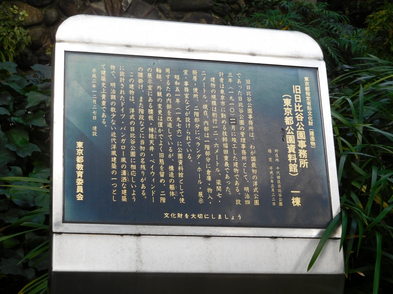 日比谷公園内にある、木造2階建てのドイツ風バンガロー様式の建物で、明治43年に建てられたものです。普段は門が閉まっている事が多いのですが、珍しく門が開いて「OPEN」の看板が置いてありました。せっかくだから中を見てみようかな、とも思ったのですが、誰も入っている気配がなく、通りかかった人も、説明板を見たりするだけで通り過ぎてしまい、気軽に入れる雰囲気ではありませんでした。結婚式会場として使われているようでもあるので、外観を見ただけになってしまいましたが、とても趣のある建物だと思いました。