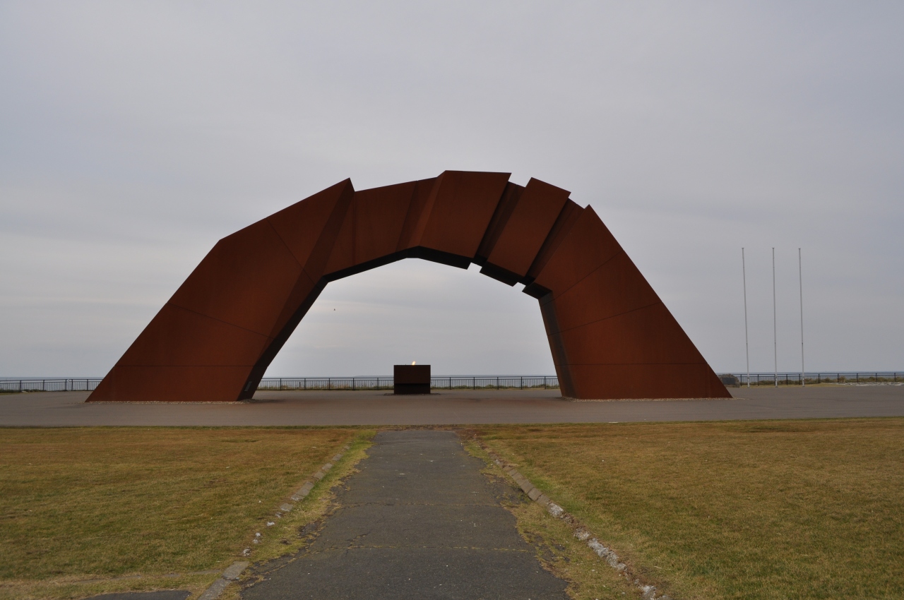 納沙布岬のすぐ近くにある北方館のそばにあるモニュメントです。非常に大きなモニュメントで、高さは13mもあるとの事です。モニュメントの中央には火がつけられており、北方領土4島が返還される日まで灯されているとありました。こちらのモニュメントは「四島のかけ橋」という名前が付けられており、昭和56年に製作されたものでした。天候は曇りがちでしたが、モニュメントの先には北方領土の国後島、歯舞群島がはっきりと肉眼で見る事ができました。