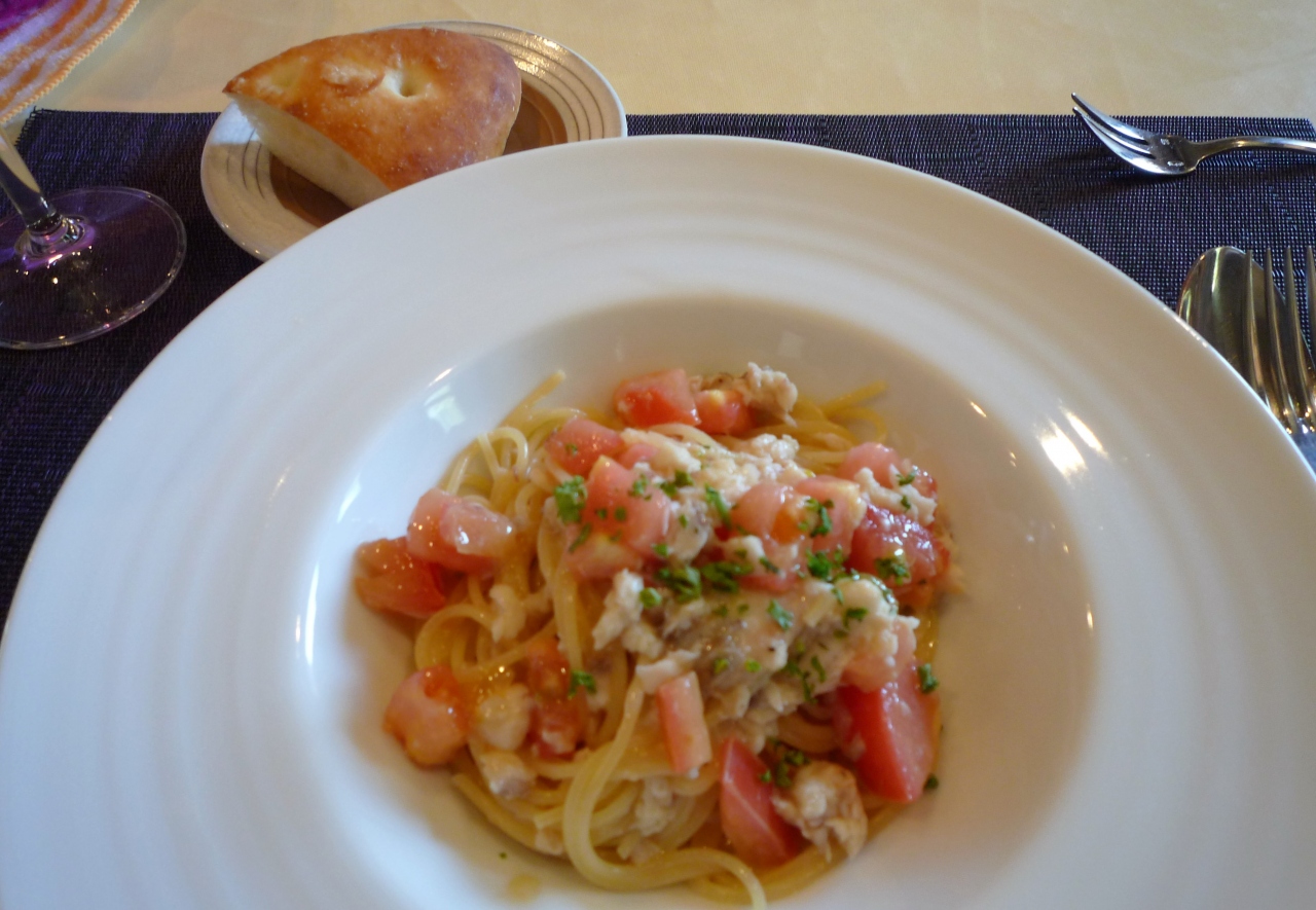 ・サラダ・魚のパスタ・肉のパスタ・デザート・コーヒーか紅茶