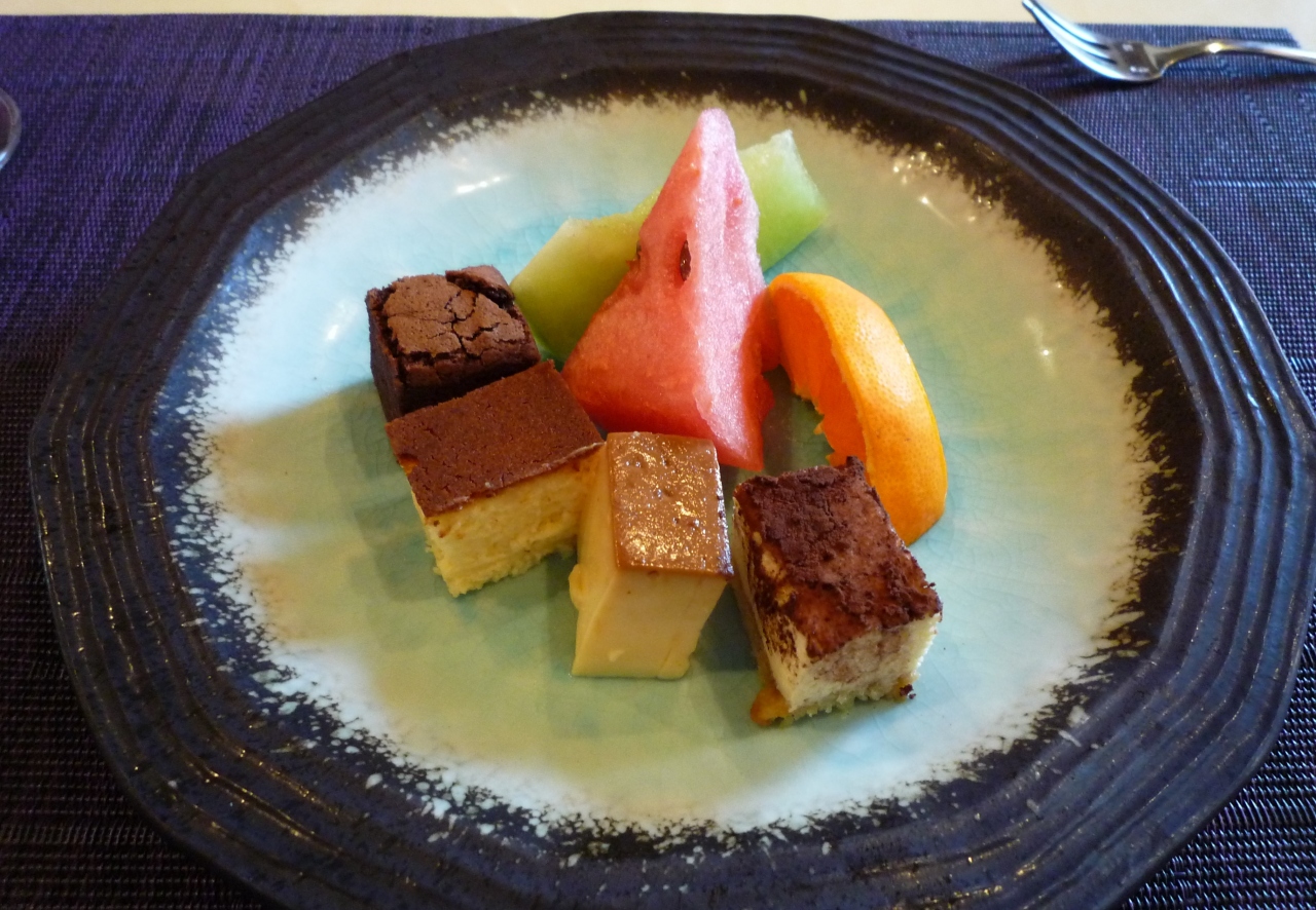 デザートはいろいろなフルーツとケーキが少しずつ盛り付けてあり、