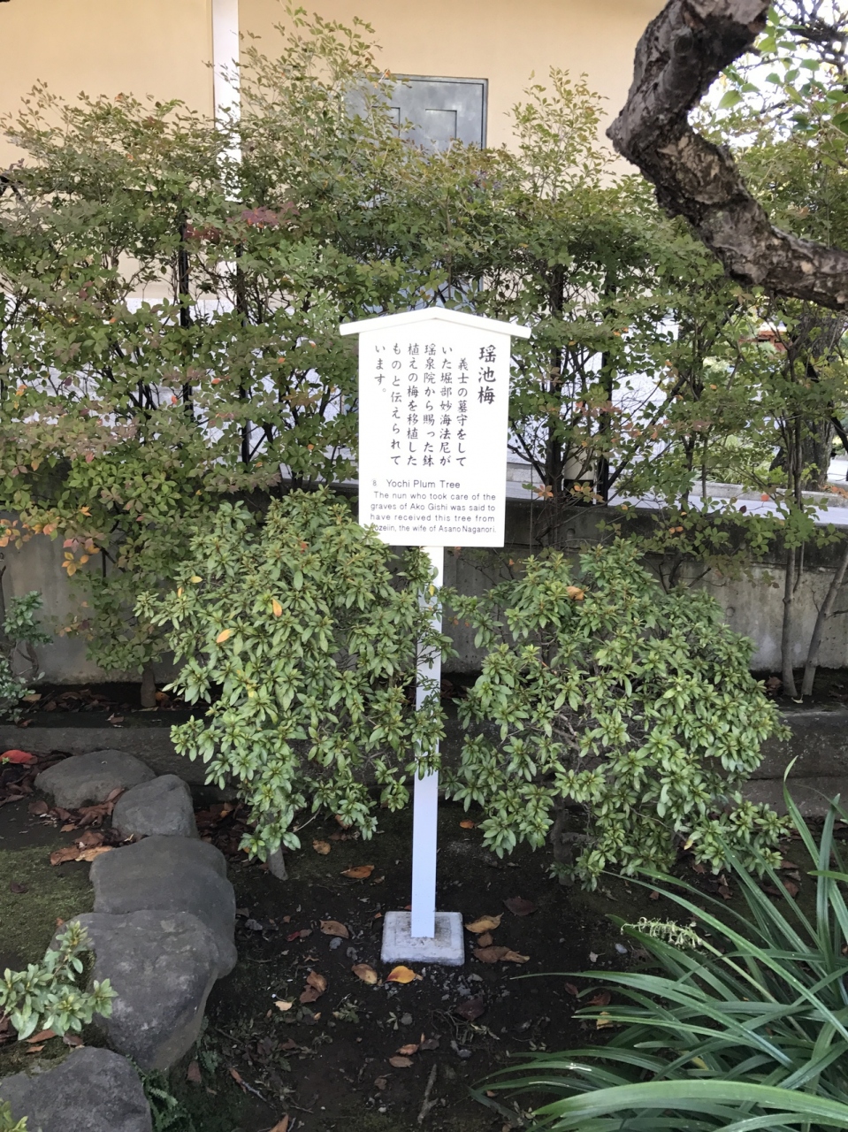 こちらの梅の木は、赤穂浪士である義士たちの墓守をしたとされる堀部妙海法尼が遙泉院から賜わったとされる鉢植えね梅の木を泉岳寺に移植されたとされております。当時植えられた梅が今現在に残っていると思うと感慨深いです。
