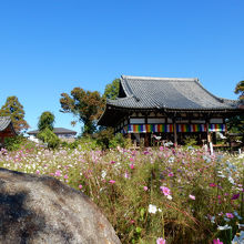 関西でコスモスが見れるスポットとして有名ですね。駐車場は無料、入館料は500円かかります。お寺の中はピンクや白、黄色やオレンジのコスモスでいっぱい!15万本くらいと野原に咲くものに比べたら規模はそんなに多くはないかもしれませんが、お寺の本堂がいい被写体となって、ナイスなカメラアングルで写真がとれます。
