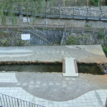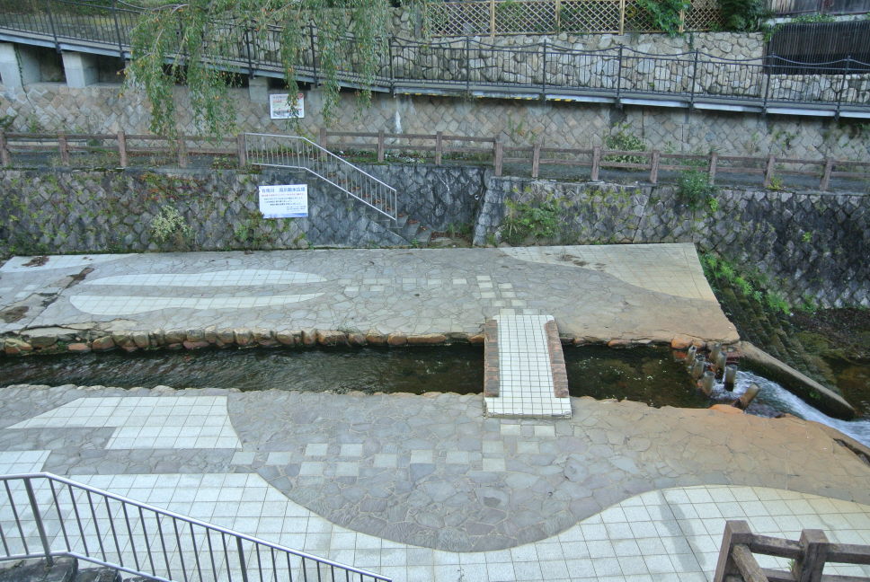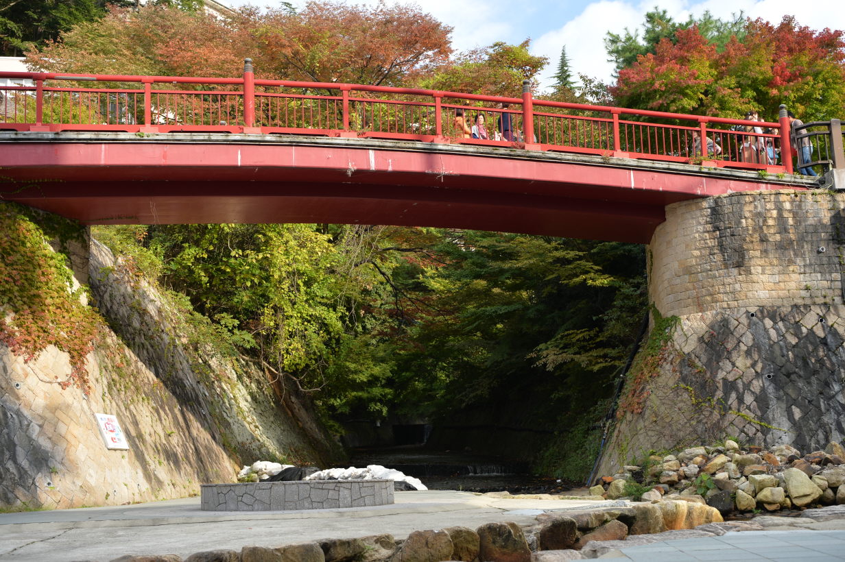 ここから見上げる赤い橋のねね橋がきれいで、たくさんの人が河原に降りて、記念撮影をしていました。コンクリートや石で整備してあるので歩きやすいです。ただ、川が真ん中に作られた細い水路を通っていますが、上流で大雨が降ったときなどは水量が増えるでしょうから要注意ですね。