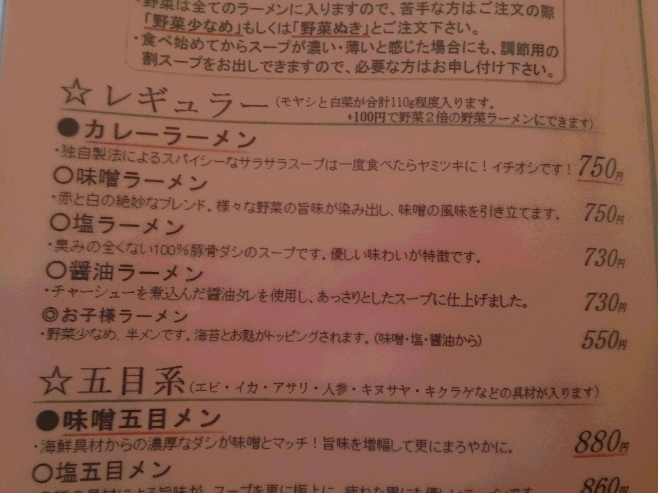 苫小牧市内から少し外れたところにあります。日翔病院の向かいにあるマンションの1階です。ごくごく普通のラーメン屋の雰囲気ですが、中に入ると、奥さんと思われる女性が親切にメニューをとりに来てくれました。こうした対応は味の良さの一つですね。奥では、ご主人が一人黙々とラーメンを作っています。メニューを見ると辛いラーメンを発見。辛いもの好きの私としては、何をさておき頼まなければという使命感が湧き、辛いラーメンの真ん中を頼みました。出てきたラーメンは期待通り、いや、期待以上のものでした。汗が噴き出すほどの辛さですが、コクがありおいしいラーメンでした。ただ、注文したのは、辛さの真ん中。一番辛いのは、どれくらい辛いのか楽しみです。次回から1つづつ辛くしていこうかと思います。