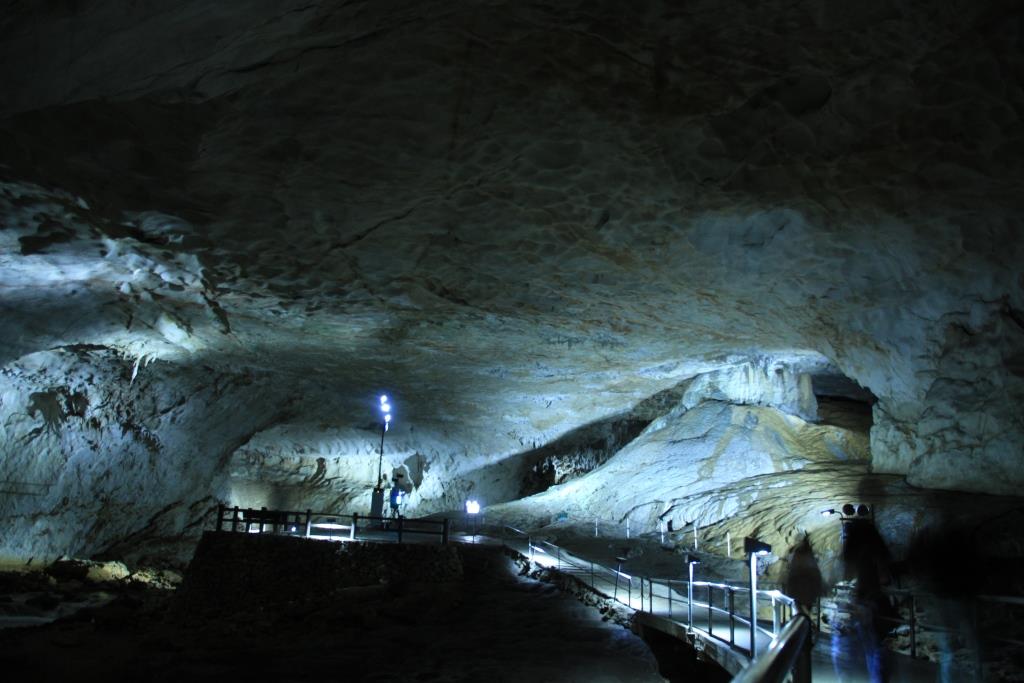 秋芳洞の正面出入口から百枚皿を過ぎると、やがて進行方向右手に大きな塊が現れます。高さは人間2人分ほどですから4メートル近くあるでしょうか。この塊は、天井から滴り落ちる石灰分を含んだ水が固まって伸びてきた石筍で、ここまで成長するのにいったいどれだけの時間がかかったことやら…と目がくらみます。富士山に見立てるとはなかなか豊かな想像力ですね。