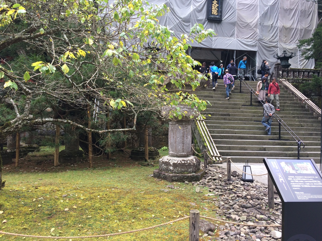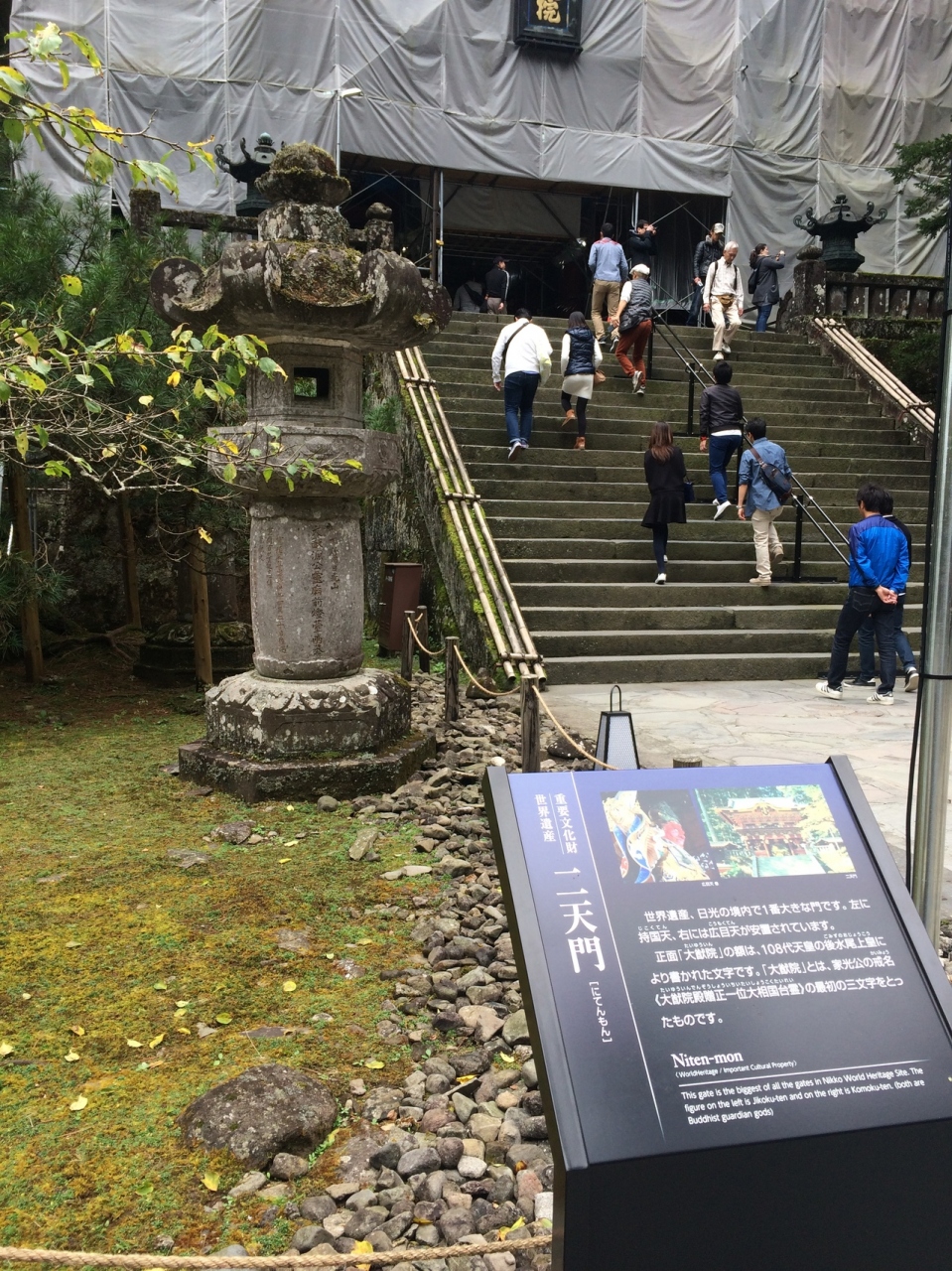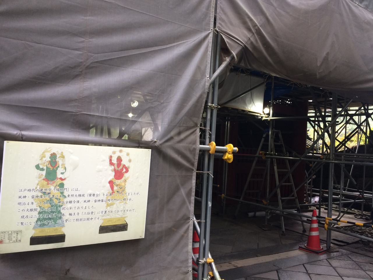 2016年10月訪問時は改修工事中で本来の姿を見ることが出来ず残念でした。日光の境内の門で一番大きな門前です。左右にある持国天・広目天も見ることが出来ず看板に写真が貼ってありました。門をくぐるリ坂を上がると展望所です。