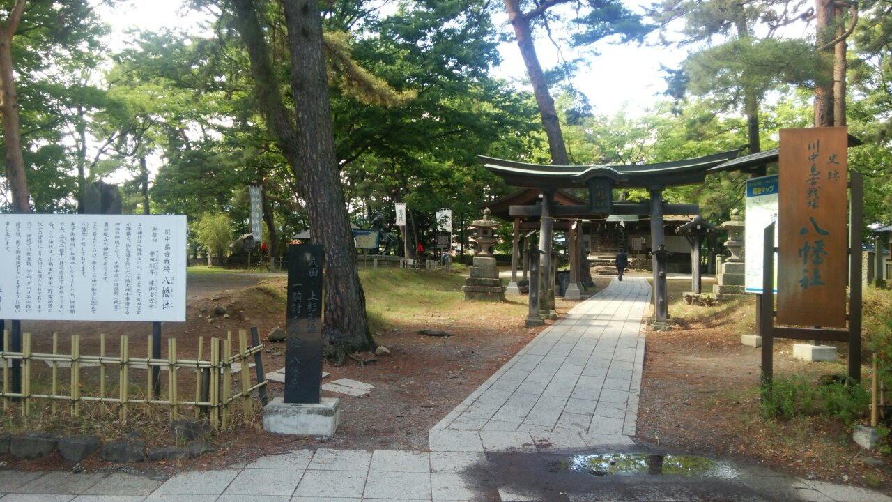 川中島の合戦の様子を再現した、謙信と信玄の一騎打ちの銅像が展示されています。広々とした園内には歴史資料館もあり、学生の社会科学習にも利用されているようです。歴史に興味がなくても、芝生がきれいで散歩するのにとても良い公園です。