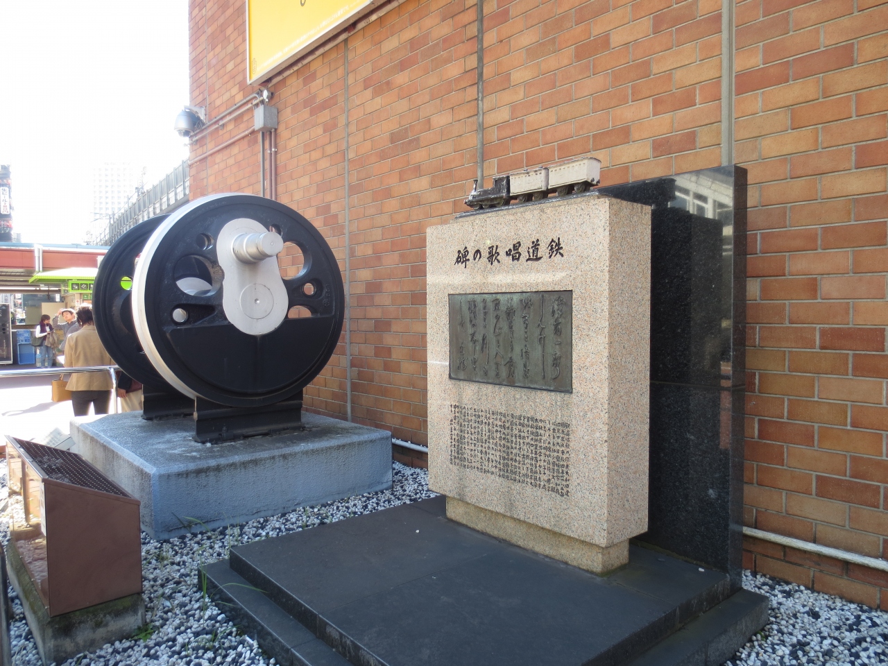 蒸気機関車の動輪が展示してあります。実際に見るとこんなに大きいんだなといった印象です。迫力ありますね。あまり目立っていないというか、注目している人がほぼ皆無でしたが、この動輪と鉄道唱歌の歌の歌詞がかかれた碑が存在感を出していました。目の前がゆりかもめの乗り場方向なので、そちらに行くときにさくっと見ることが出来ます。