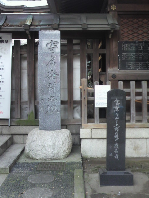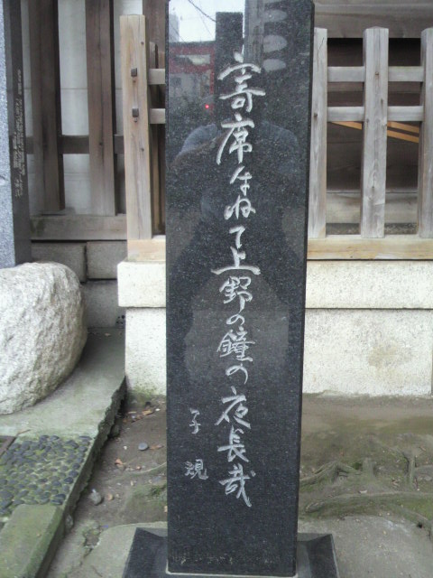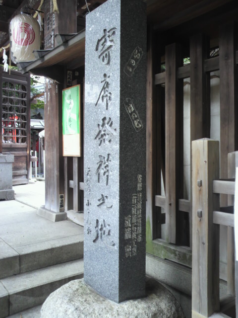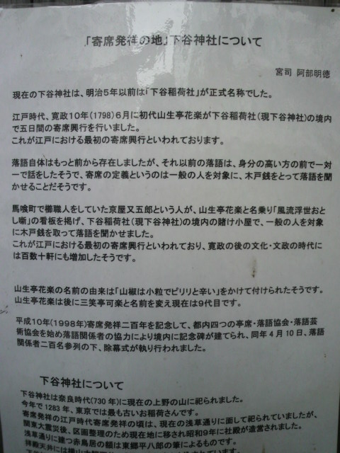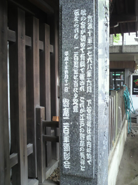 下谷神社の石の鳥居を入ると、山門があり、その右横に、寄席発祥の地の石碑が立てられています。