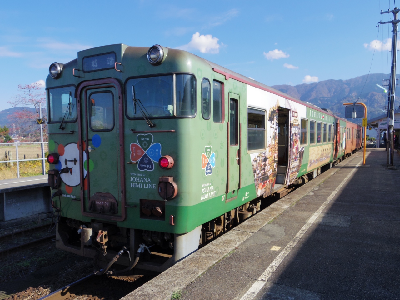 高岡から城端まで29,9km、電化されていないため、気動車が走り抜けています。