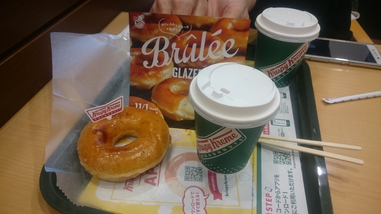 11/1~の新作(&店舗も限られてるみたいです)ブリュレグレーズドカスタード&ホットラテを頂きました。セットで¥50OFFです。