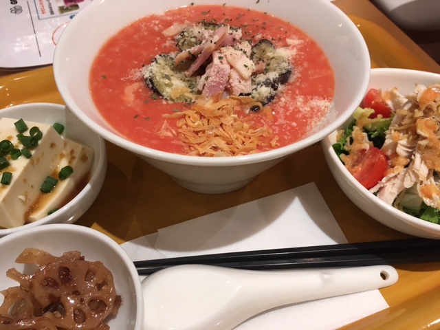 千円のディナーセット、お粥(トマト・チーズ・茄子のお粥)+お惣菜2品(レンコン、冷奴)+サラダ(鶏のサラダ)という組み合わせで注文。ほどなくトレーが運ばれて来た。
