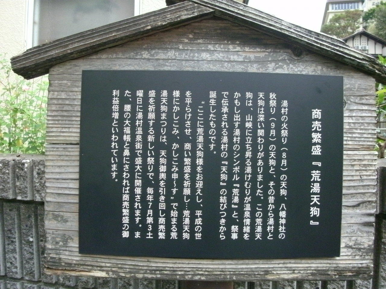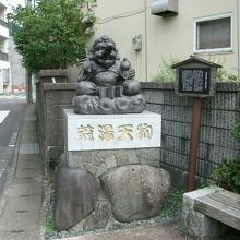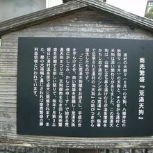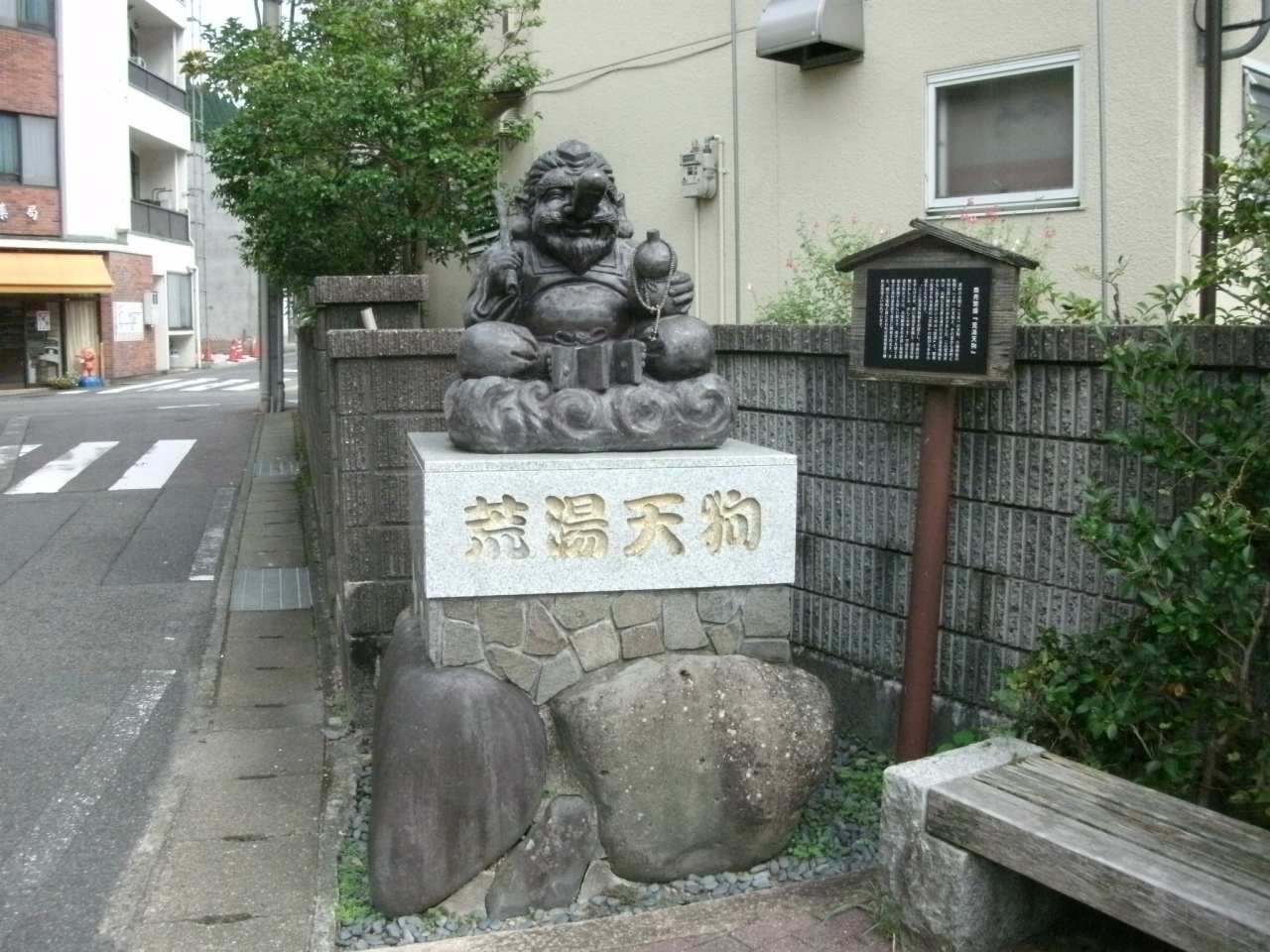 荒湯の近く、コンビニの斜め向かいに「荒湯天狗」の像が鎮座されています。道路沿いにあるのですが、少しへこんだところに鎮座されているため、天狗さんの正面から見ると気づきやすいが、天狗さんの背中側から道路を通るとほとんどの人が気づかず通り過ぎるようです。笑い顔の天狗さんは愛嬌があって可愛らしいです。傍にある説明板(添付写真)には、『腰の大福帳と鼻にさわれば商売繁盛の御利益倍増』と書かれていて、ご利益を求める人が多いらしく、天狗さんの鼻はピカピカに光っていました。