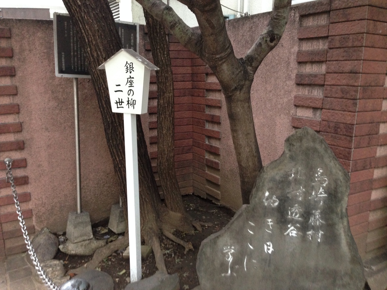 泰明小学校の左手脇にひっそりとあります。銀座の柳と名がつくだけあり都会の木にしては大きい。季節のせいもあるのでしょうけれど、葉っぱはちよっとさみしかった。