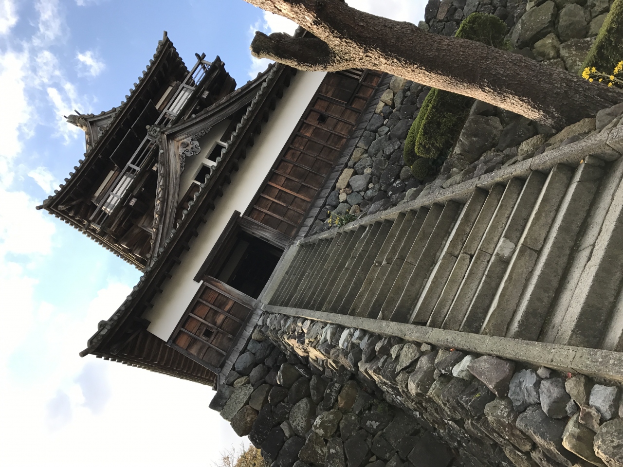 進んでいくと天守閣に向かう石段がかなりの急勾配、ここで足の弱い人は諦めた方がよいです。石の階段は踏み面が一定でなく上りにくく作ってあるそうです。