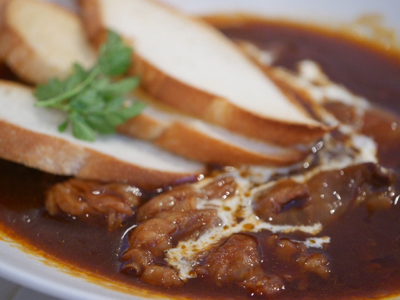 「牛スジ肉の赤ワイン煮込み」を注文しましたが、牛スジ肉がほろほろと溶けるほどに柔らかく、とても美味しくて感動しました。運ばれてきた時は、足りるかな?と思いましたが、意外と食べごたえがあり、かといって味がくどいわけではなく、とても満足しました。トイレが1つしかないのですが、広くて豪華で、貴族の家みたいでした。