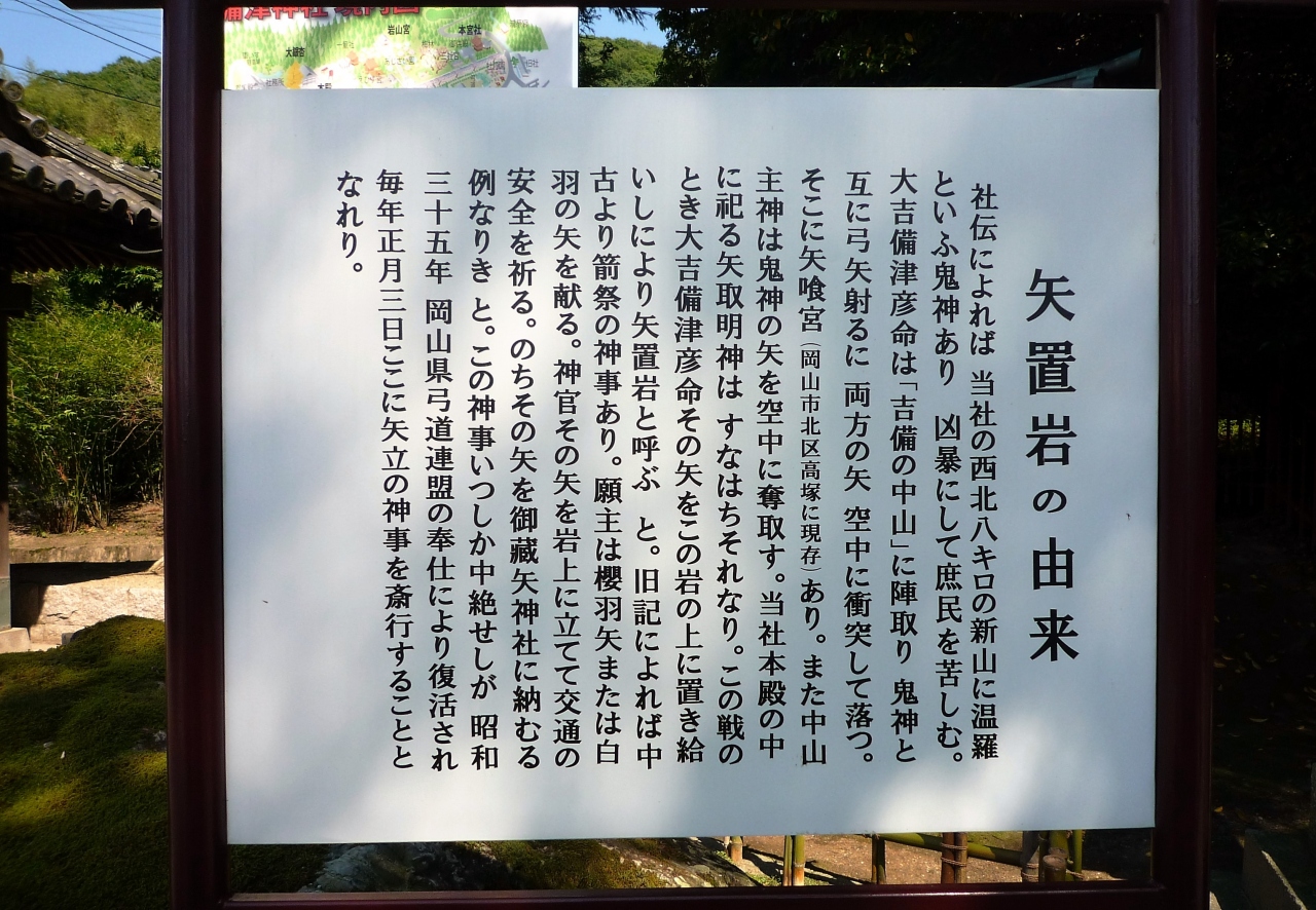 吉備津彦命がこの岩に矢を立てて温羅を退治したという伝説が残っているそうです。
