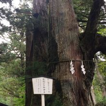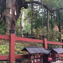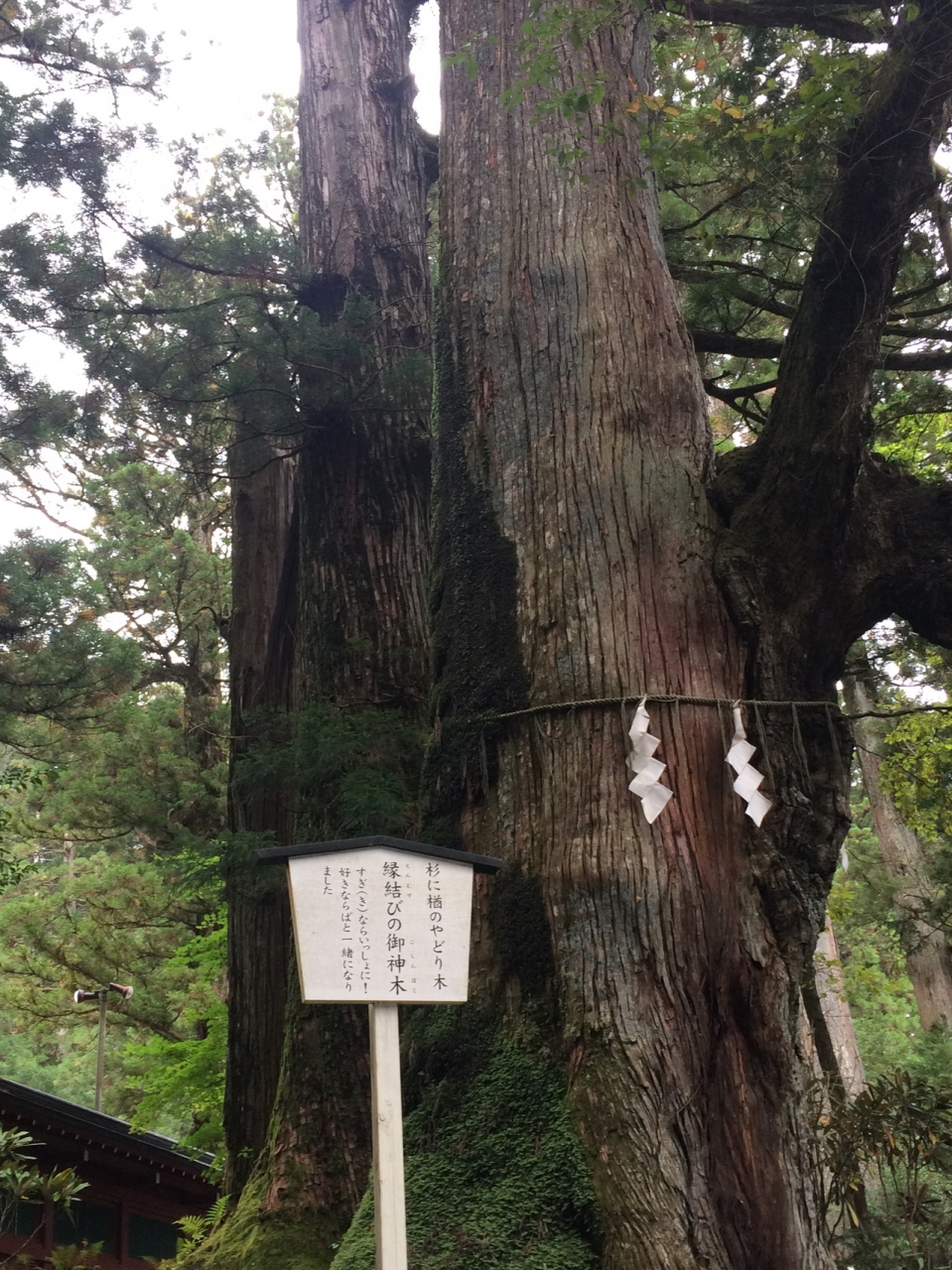 大木の杉の木で、木々の前には赤い柵があり木も縄が巻かれているので神木と言う感じがします。縁結びの木なので木にもお賽銭箱が置かれ、左右には願い事を吊るす小さな屋根付きの物があり、板で書いたいくつかの願い事が置かれていました。